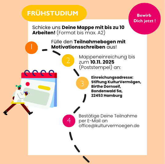 Das FRÜHSTUDIUM (für Schüler:innen im Alter von 16 bis 18 Jahren) ist ein besonderes Programm der Hochschule und unterliegt nicht den regulären Anmeldefristen. Die Bewerbung erfolgt über die Stiftung KulturVermögen, die das Vorschlagsrecht für die Auswahlkommission der Hochschule hat.